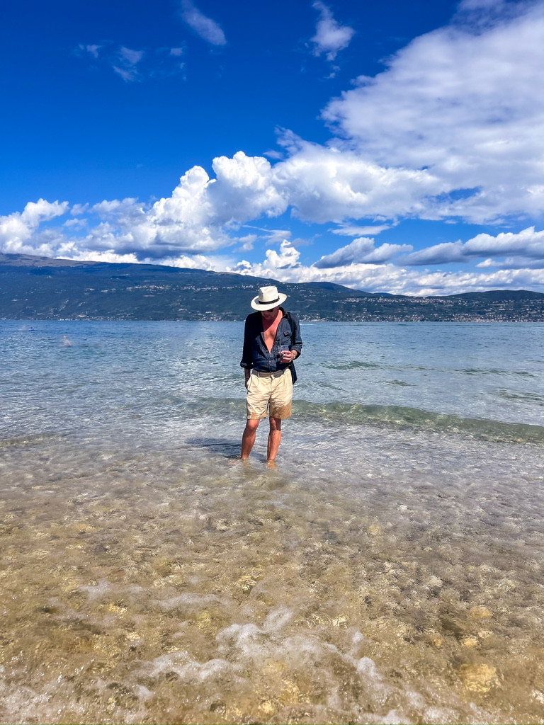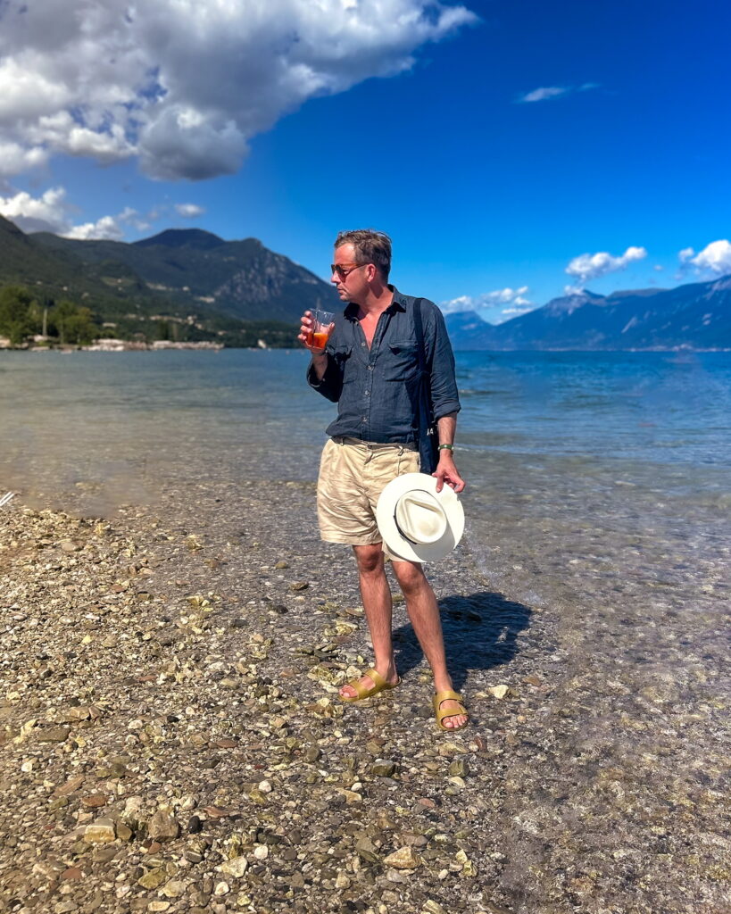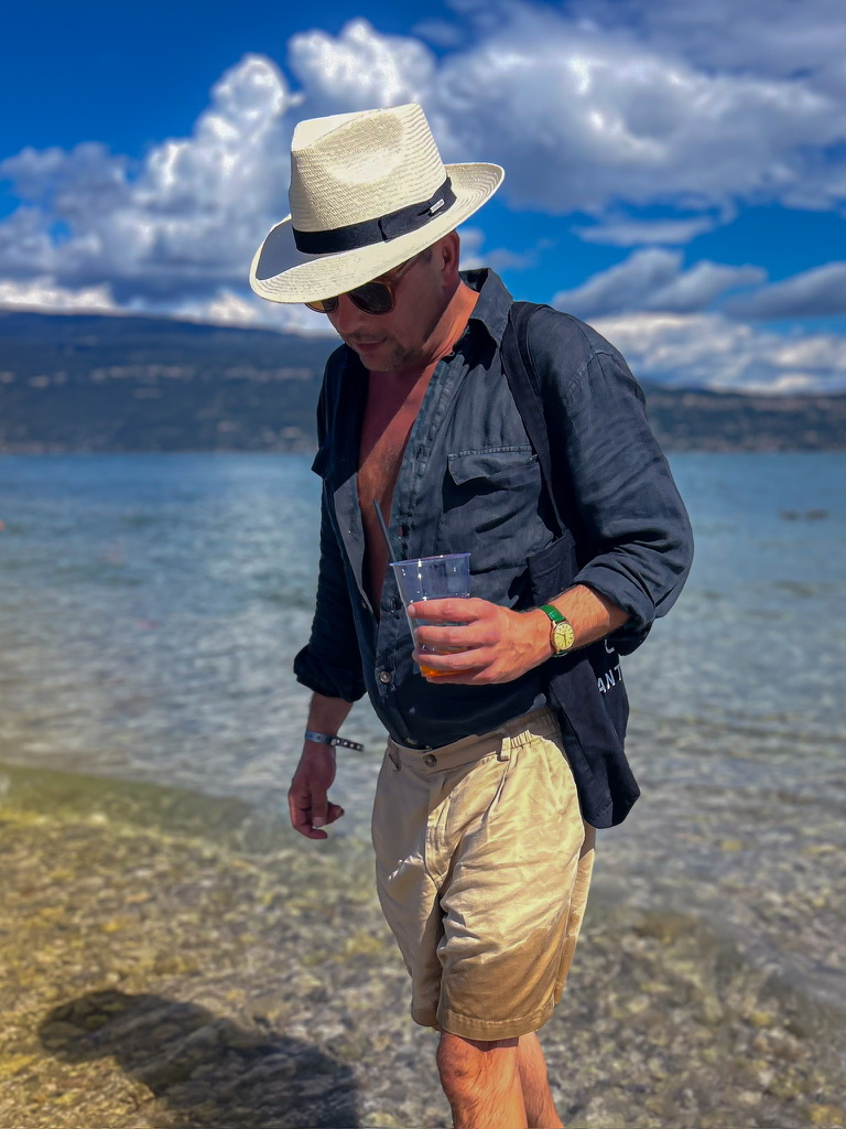 Der Hut: ein Stetson Panama, aus Stroh, handgeflochten irgendwo in Ecuador. Leicht, widerstandsfähig, praktisch. Das Hemd: Safari-Schnitt, Leinen in Anthrazit. Kühlt, trocknet schnell, zerknittert würdevoll. Stoff für Hitze und Bewegung. Die Shorts: Eine kurze Hose von H&M, beige, mit Bundfalte. Billig, aber brauchbar. Die Sandalen: Birkenstock in Gold. Deutsche Ikone zwischen Orthopädie und Alltag. Unprätentiös, robust. In der Hand: Aperol Spritz, Plastikbecher. Nichts Feierliches, nur ein Getränk.