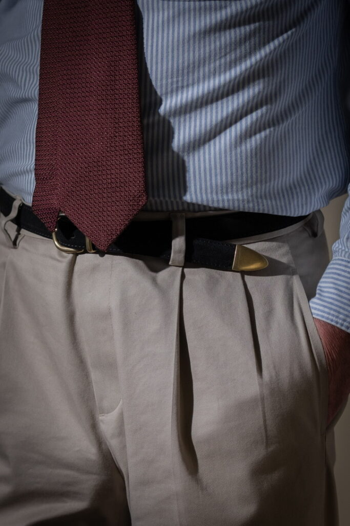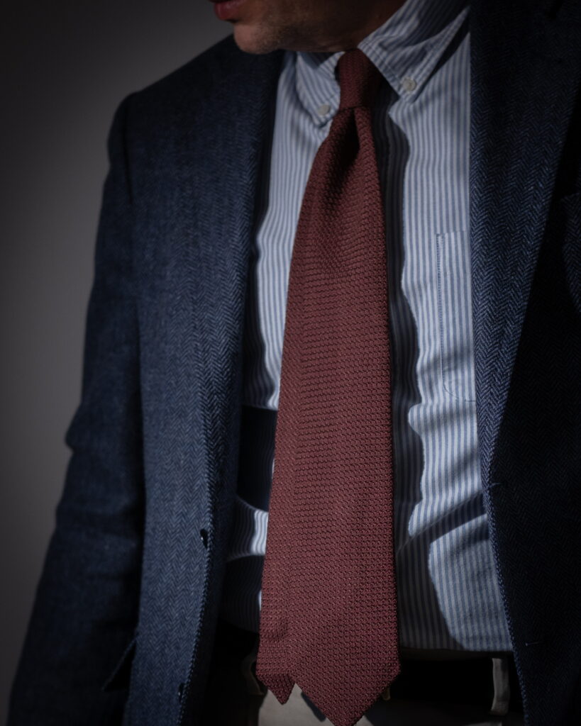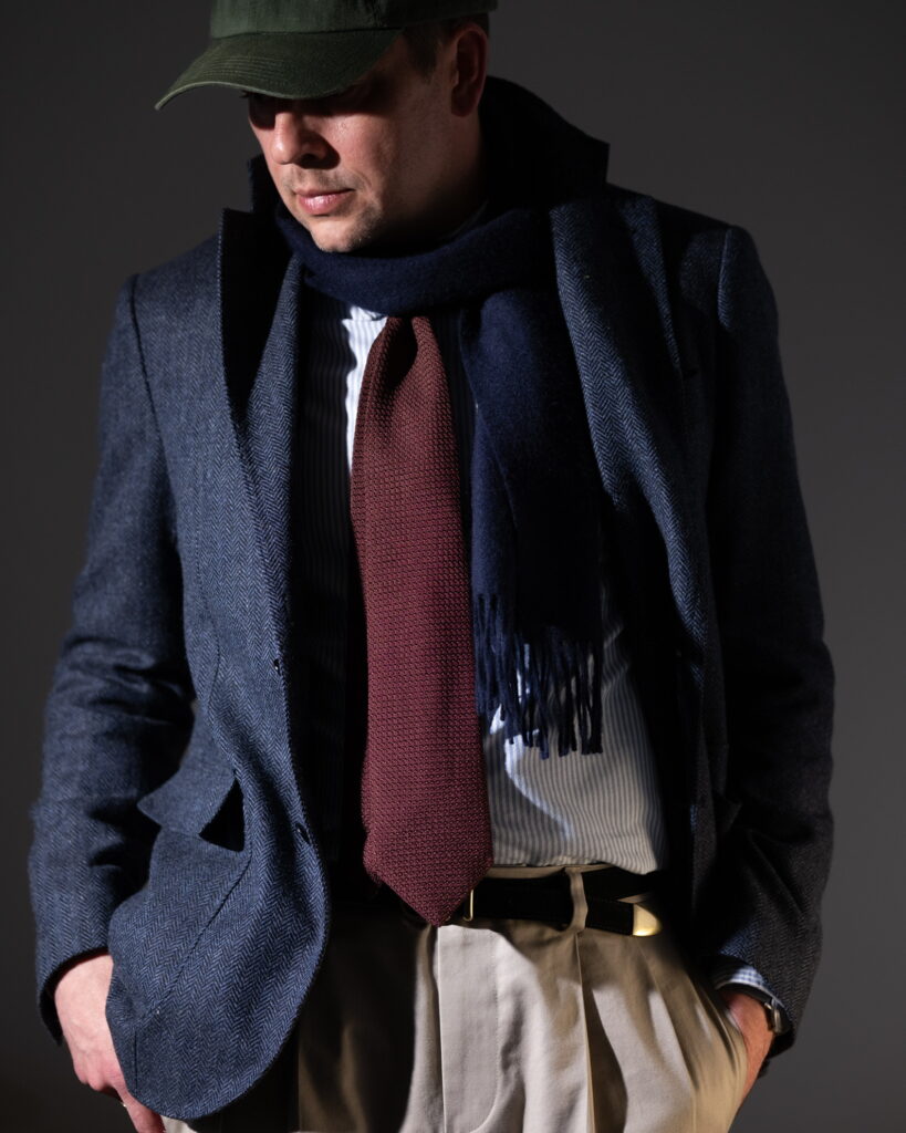Stylistically, the system aligns with classic tailoring but shifts through material emphasis. The grenadine tie—historically formal—becomes the most texturally active element. The rest of the outfit supports it through restraint.