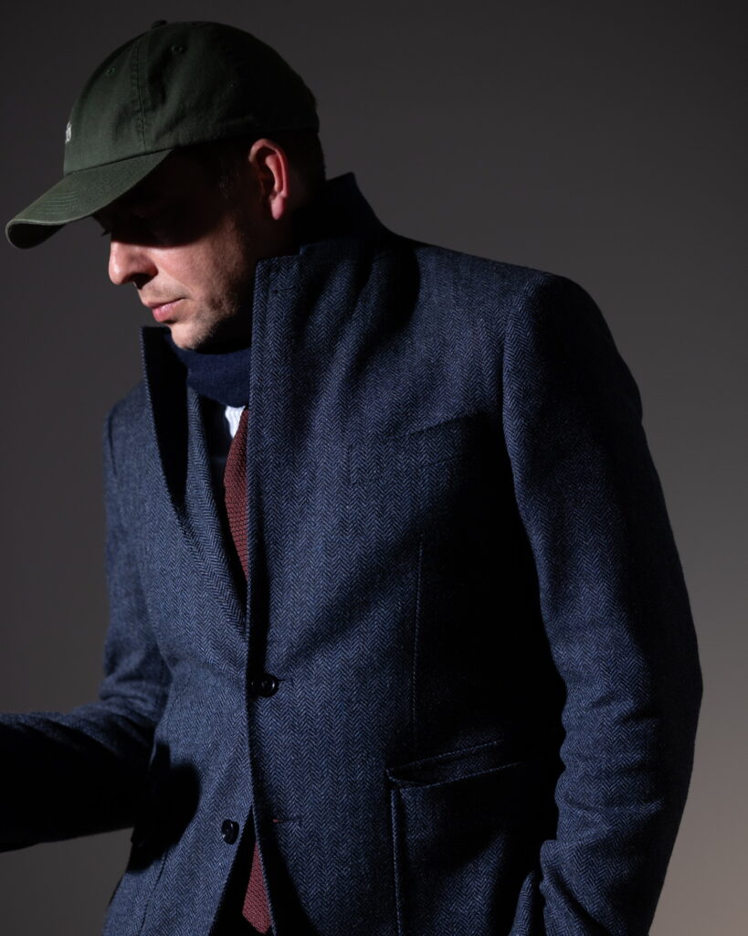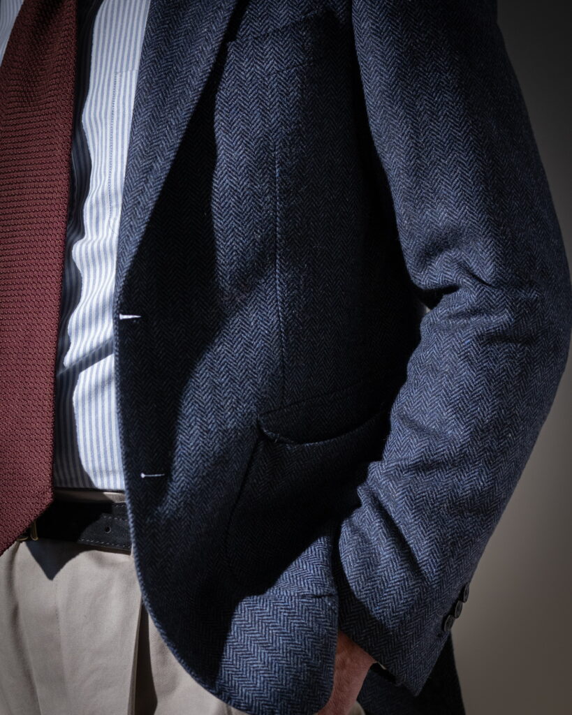 The blazer, in a navy herringbone wool, operates differently. Its pattern emerges only under light, with the chevron structure catching highlights intermittently. This creates a restrained, rhythmic texture—less active than the tie, but more structured.